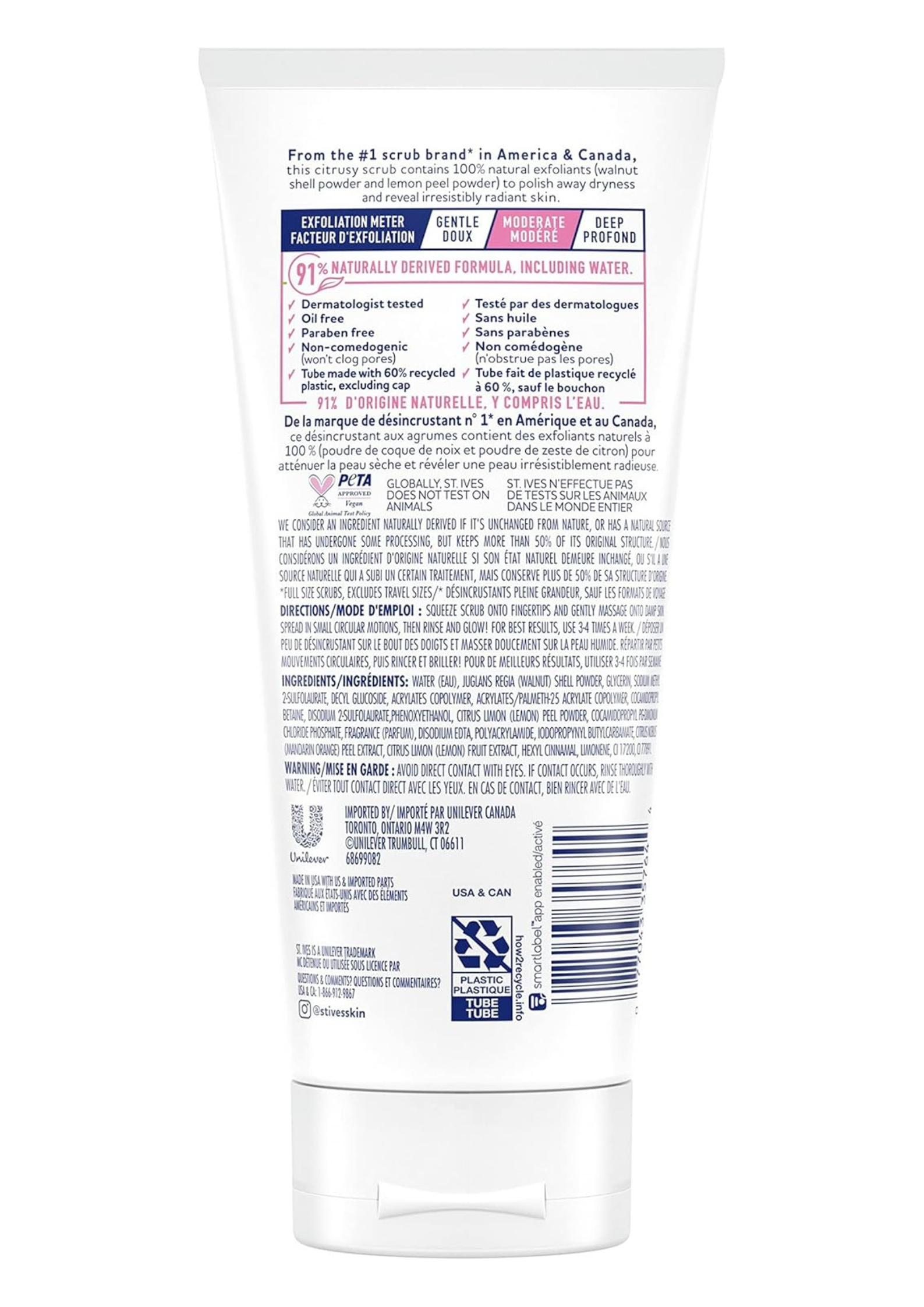 - St. Ives Radiant Skin Pink Lemon & Mandarin Facial Scrub is packaged in 60% recycled plastic, excluding cap