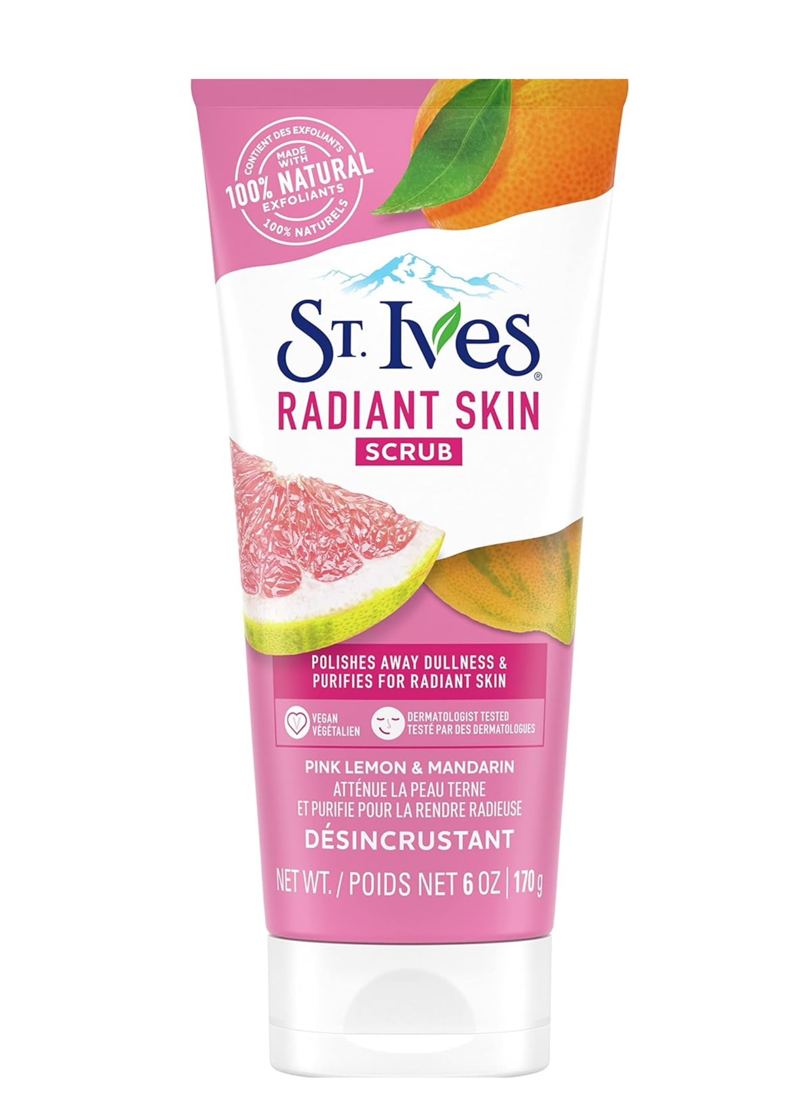 - St. Ives Radiant Skin Pink Lemon & Mandarin Scrub polishes away dullness & purifies for radiant skin