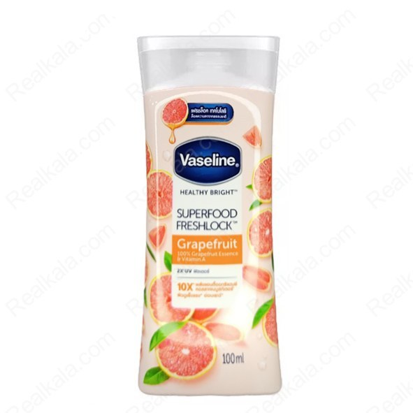 Vaseline Healthy Bright Superfood Freshlock grapefruit Body Lotion is designed to brighten skin and lock in moisture, offering benefits from natural grapefruit essence, Vitamin C, and UV protection.